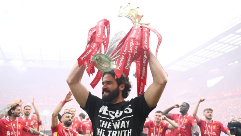 O goleiro Alisson comemorou o título da Premier League e comandou a festa dos Reds em Anfield, após o empate em 1 a 1 com o Crystal Palace [maio/2025], a segunda conquista do arqueiro na competição.